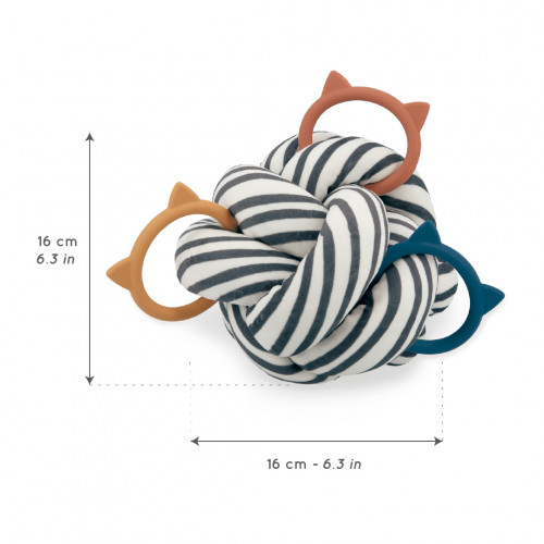 Une balle dédiée à l’éveil sensoriel des bébés ! Elle permet de stimuler la vue, le toucher et la préhension des tous petits. La balle présente une forme originale faite d’entrelacements, ce qui la rend facile à saisir par bébé et encourage sa motricité fine. De plus, ces motifs contrastés captivants permettent de stimuler la vue du tout-petit, qui perçoit mieux les contrastes à la naissance. Enfin, 3 anneaux en forme de chats donnent une dimension supplémentaire à ce jouet d’éveil : de couleurs variées, ils sont en silicone et peuvent être retirés et replacés sur la balle à votre guise. Les changer de place sur la balle régulièrement permet de continuellement attiser la curiosité de bébé, qui va adorer s’en saisir ! Ils font également office d’anneaux de dentition.