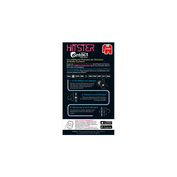 Devenez le Hitster en réussissant à être le premier joueur à placer correctement 10 cartes hits dans l’ordre chronologique sur votre ligne du temps. Cette version est compatible avec les autres éditions du jeu.
