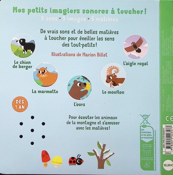Des matières variées et des sons très nature pour découvrir 5 animaux : – Le chien de berger – La marmotte – L’ours – Le mouflon – L’aigle royal. Un livre complet, avec des sons de qualité et de belles matières à toucher pour éveiller les sens des tout-petits.