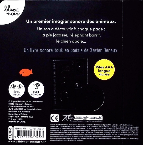 En noir et blanc, avec quelques touches de couleurs, Xavier Deneux représente 10 animaux : le chat, l’oiseau, la grenouille, le cochon, le mouton, etc. Le fort contraste des couleurs permet de stimuler l’éveil visuel de bébé. Un livre sonore pensé pour les tout-petits.
