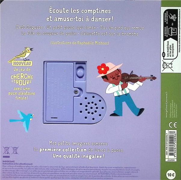 Ecoutez les comptines et amusez-vous à danser sur : – C’est Gugusse – Un petit pouce qui danse – J’ai un pied qui remue – La fille du coupeur de paille – L’alouette est sur la branche… Et toujours à la fin, un jeu de cherche et trouve sonore grâce à une puce aléatoire inédite et très ludique !