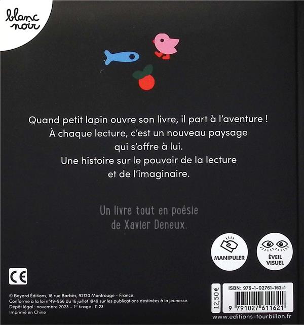 Un lapin lit un livre vert et hop, il se retrouve dans une forêt… Sur chaque page, le lapin lit un livre d’une couleur qui raconte une histoire et le projette dans celle-ci.